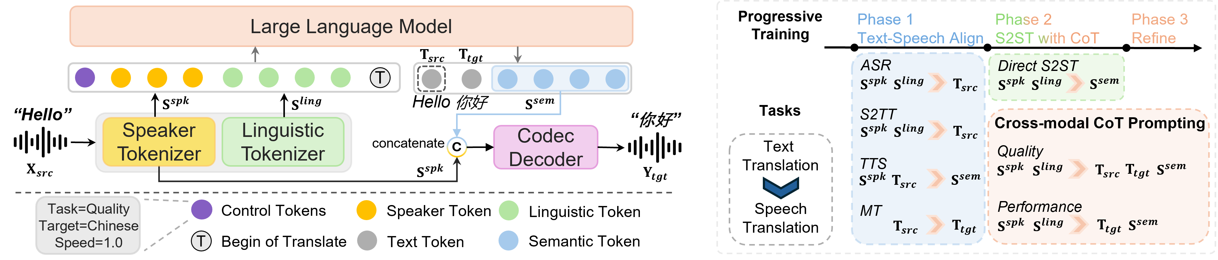 Figure 2. Overview of UniSS architecture, cross-modal CoT prompting and 3-phase progressive training.