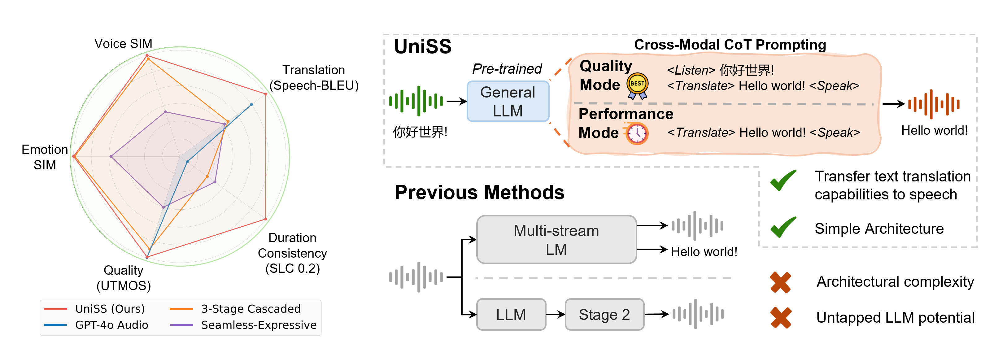 Figure 1. UniSS integrates pre-trained text LLMs and transfers their translation capabilities to the speech domain. UniSS outperforms both end-to-end S2ST systems and cascaded systems on translation fidelity, expressiveness preservation, duration consistency and speech quality